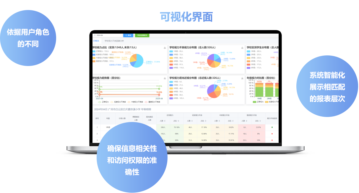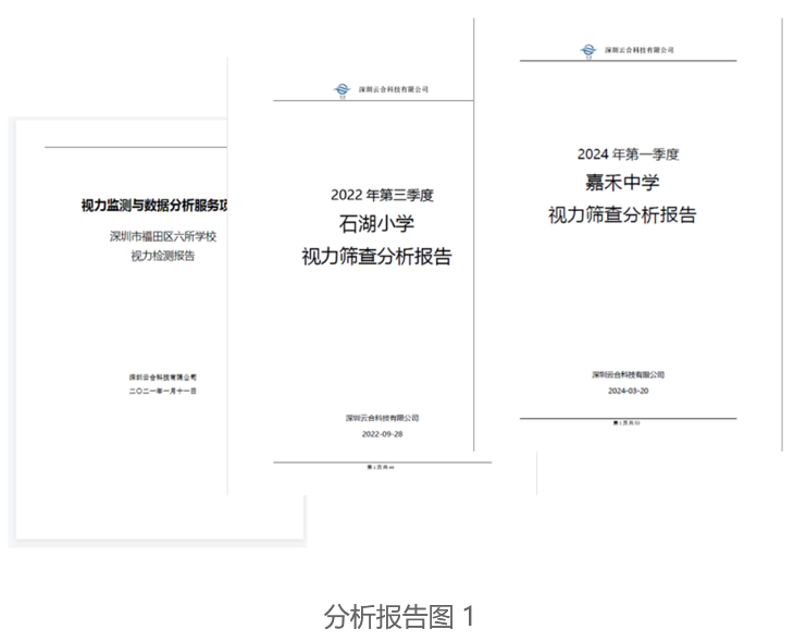 根据检测结果,自动生成详尽且个性化的班级/年级/校级/区域级分析报告,涵盖视力状况、变化趋势及专业建议,